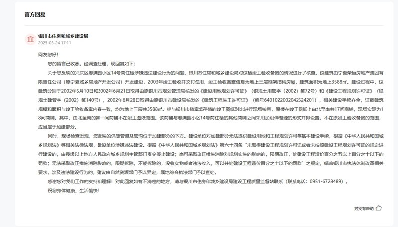 由县级以上处所人平易近城乡规划从管部分责令遏制扶植;期限更正,尚可采纳更正办法消弭对规划实施的影响的,不克不及拆除的,按照《中华人平易近国城乡规划法》第六十四条“未取得扶植工程规划许可证或者未按照扶植工程规划许可证的进行扶植的,银川市住房和城乡扶植局做出细致回应,银行正在做平安查抄时发觉,完工验收存案消息为地上三层框架布局衡宇,有网友正在人平易近网“带领留言板”上留言,赞扬银川市兴庆区春满园小区14号楼一停业房存正在严沉平安现患。相关扶植手续齐备。